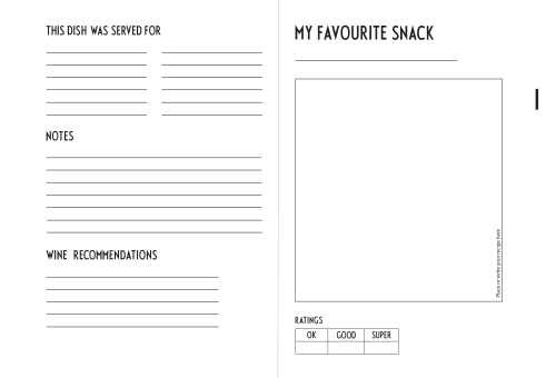 美麗大方的筆記本,協助您將所有最愛的食譜分門別類,收進一本「最愛食譜」。預先設計好的索引目錄讓您一目了然,每種品類規畫了10個食譜,在質不在量。已設計好實用的骨架、讓您填入自己的見解,完成一本獨一無二的「最愛食譜」。空白大框可以附贈的雙面膠片貼上點心誘人的照片,吸引目光。點心的用途(適合什麼場合)、你的筆記、連能搭配什麼酒/飲料都貼心的設計進去。飲料也有設計「適合搭配的食物」,讓您花一次工換來往後的便利。