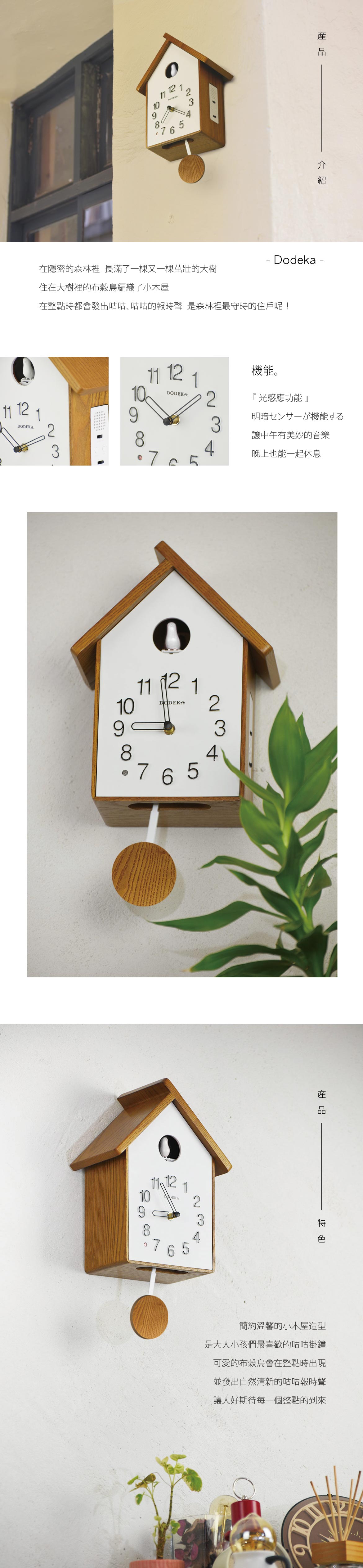 簡約溫馨的小木屋造型,是大人小孩們最喜歡的咕咕搖擺掛鐘,可愛的布榖鳥會在整點時出現,並發出自然清新的咕咕報時聲,讓人好期待每一個整點的到來。
