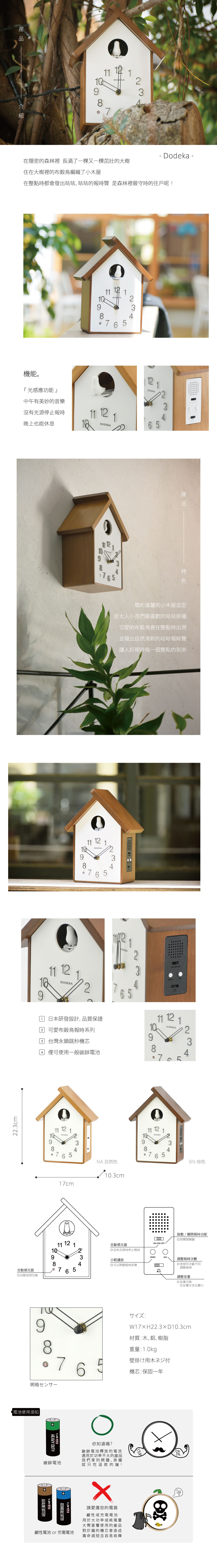 ・日本研發設計,品質保證・可愛布穀鳥報時系列・台灣永鎮跳秒機芯・僅可使用一般碳鋅電池・光感應功能:中午有美妙的音樂,沒有光源停止報時。晚上也能休息![]()
