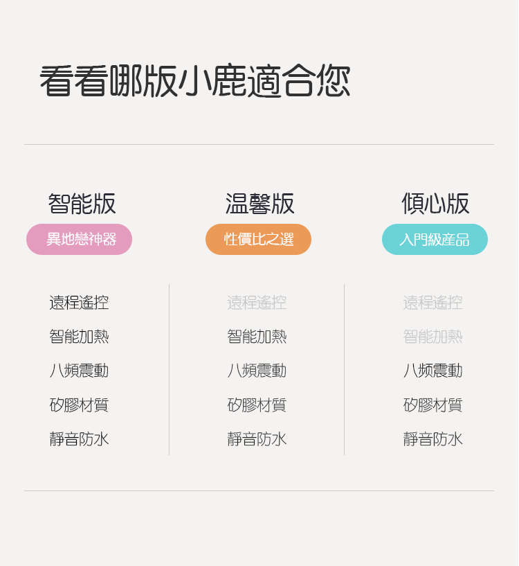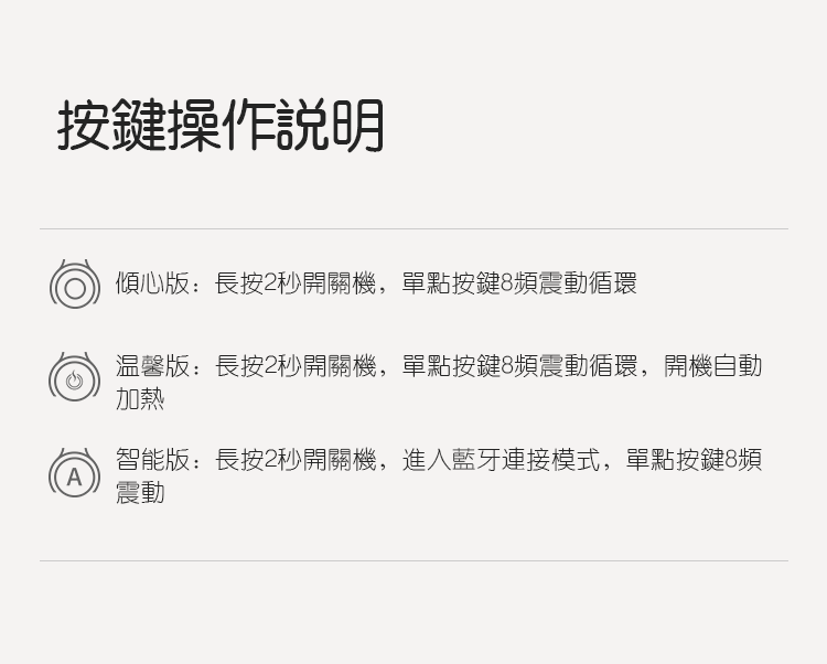 傾心版無藍牙連結App、無遠端操控、無加熱功能溫馨版無藍牙連結App、無遠端操控、有加熱功能智能版有藍牙連結App、有遠端操控、有加熱功能
