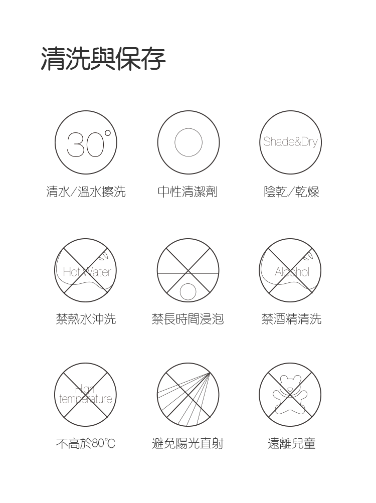 ・請以清水清洗或中性清潔劑擦拭,切勿以揮發性之清潔劑洗滌。