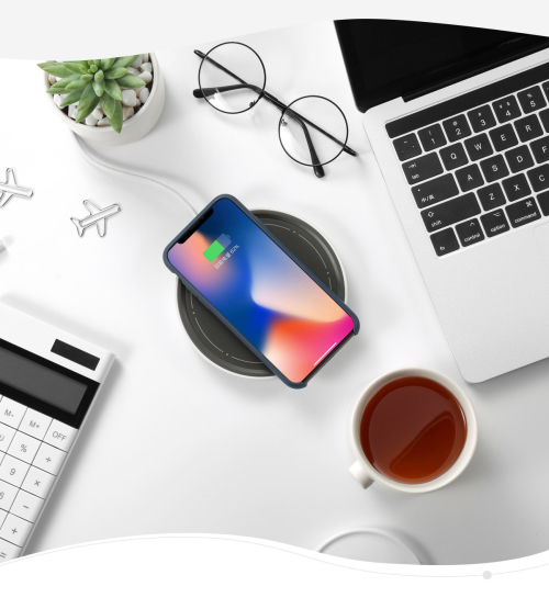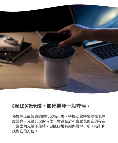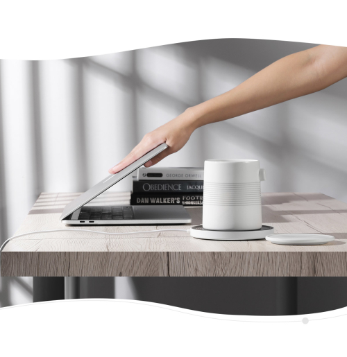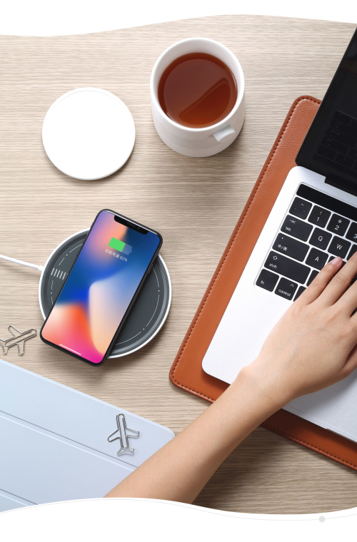 當你的桌面上擁有一個停機坪的時候,手機充電這件事 將會徹底擺脫充電線的煩惱,移開水杯,放置手機,利用 零碎時間補充電力。