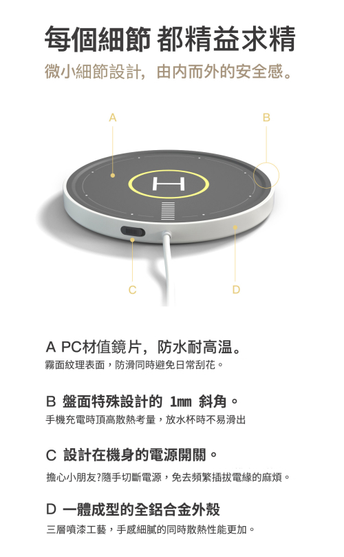 至於恆溫水杯則使用了更為先進的無線加熱方式,完全 無需擔心表面過熱的問題,實測移開水杯後僅需30秒, 停機坪即可冷卻至不燙手的溫度。