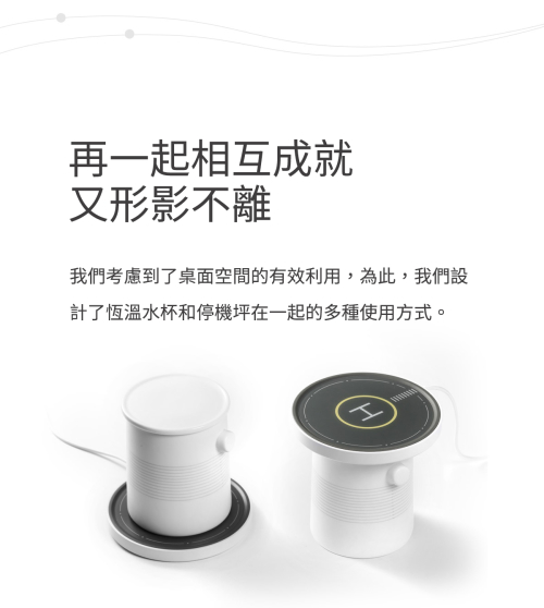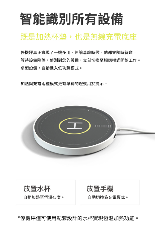 既是加熱杯熱,也是無線充電底座停機坪真正實現了一機多用,無論甚麼時候,他都會隨時待命, 等待設備降落。偵測到您的設備,立刻切換至相應模式開始工作。 拿起設備,自動進入低功耗模式。加熱與充電兩種模式更有單獨的燈號用於提示。放置水杯:自動加熱至恆溫45度。放置手機:自動切換為充電模式。*停機坪僅可使用配套設計的水杯實現恆溫加熱功能。![]()