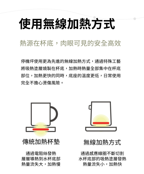 停機坪使用更為先進的無線加熱方式,通過特殊工藝 將吸熱塗層燒製在杯底,加熱時熱量全部集中在杯底 部位,加熱更快的同時,底座的溫度更低,日常使用 完全不擔心燙傷風險。
