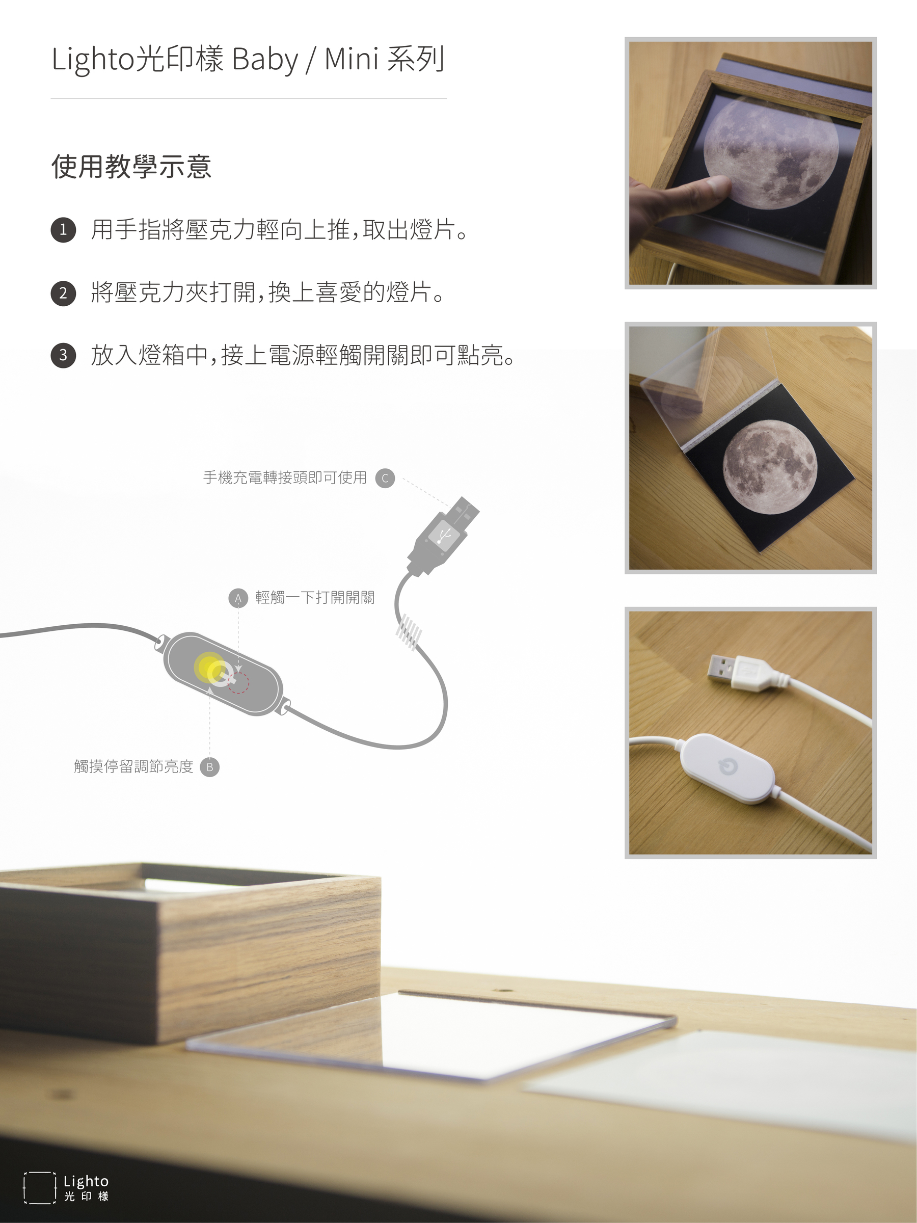 『Lighto光印樣』 具有七種量產型燈箱,使用多款實木手工製成,並賦予獨特藝術價值。小燈箱以USB供電可讓使用者更為方便攜帶使用、大燈箱使用旋鈕調光使得燈箱更具手感溫度,皆具有調光功能並可隨心抽換藝術燈片,讓光印樣的美好燈箱更能融入每個人的生活場域,成為專屬於你的日常風景。