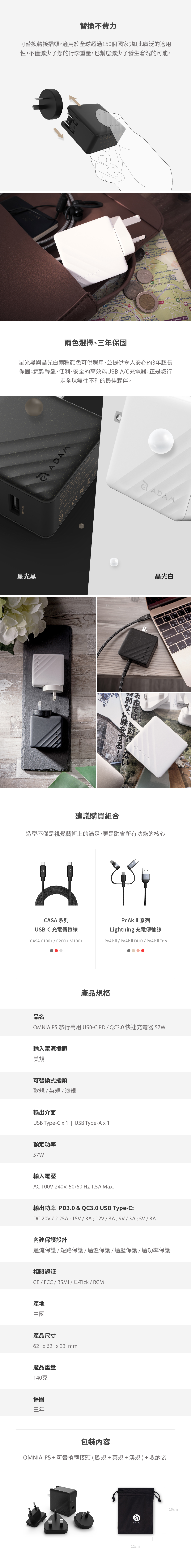 ・包裝內容:OMNIA P5 + 可替換轉接頭(歐規 + 英規 + 澳規) + 收納袋