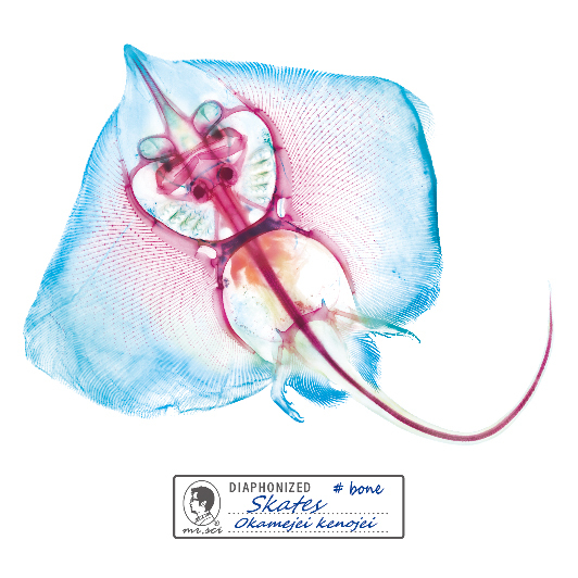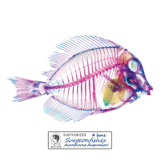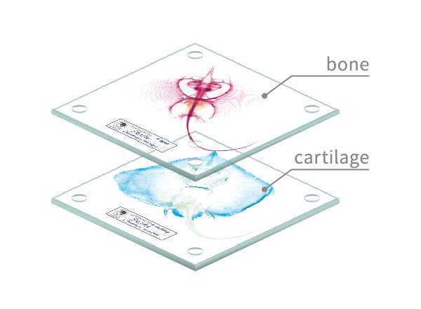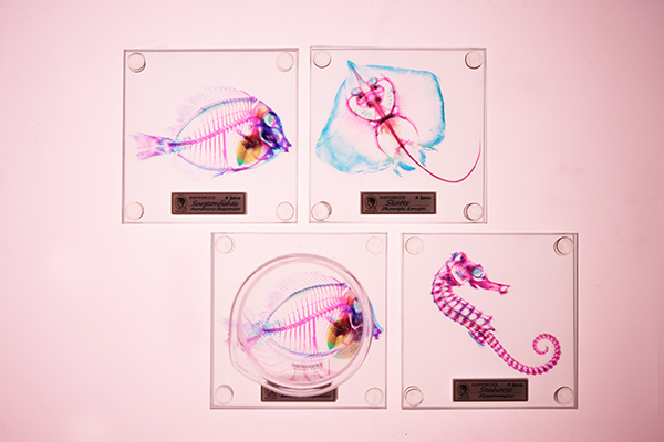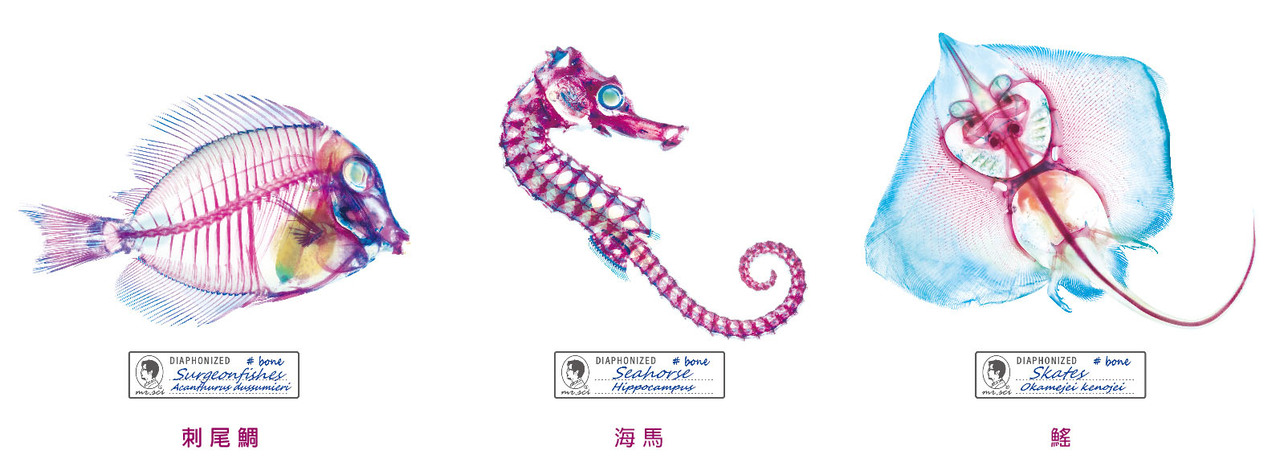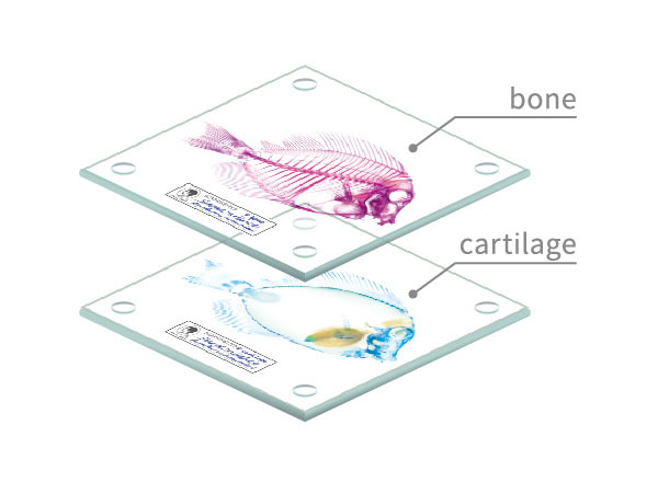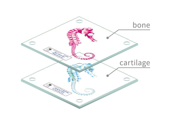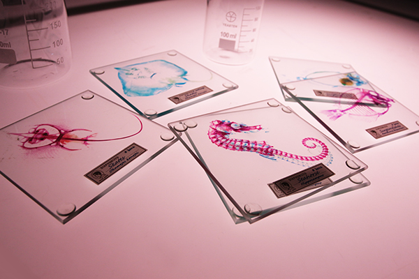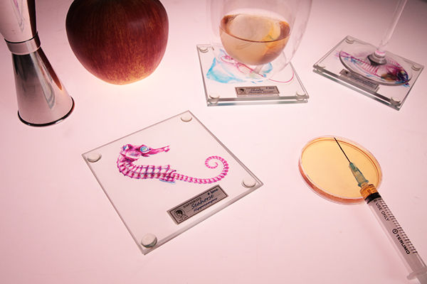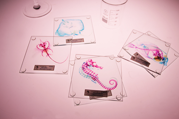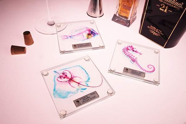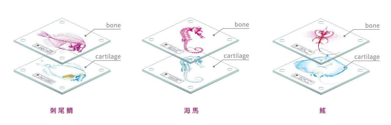 使用真實且細緻度極高的透明魚實拍照做為玻璃杯墊素材,兩片杯墊分別呈現了骨頭和軟骨在染色後的漸變、鮮豔效果。