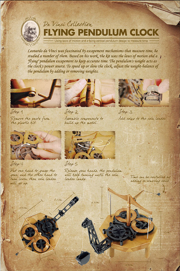 重現達文西(Leonardo da Vinci)的天才設計,新手也能輕鬆完成的模型!組裝時務必確認每個零件組裝確實且密合,以確保組裝完成後模型正確運轉。