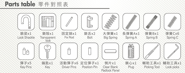 ▲全套零件與工具,讓你從頭窺探鎖的奧秘。