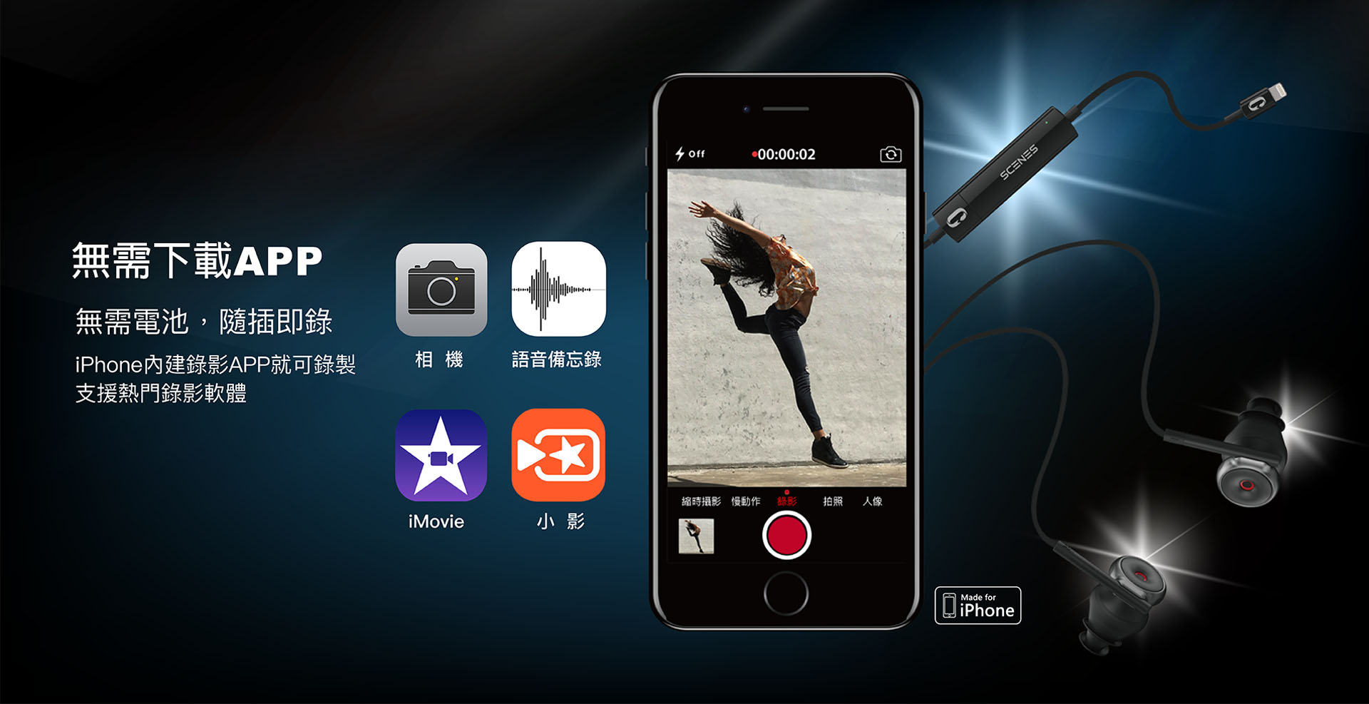 無需電池,隨插即錄,iPhone 內建錄影 APP 就可錄製支援熱門錄影軟體