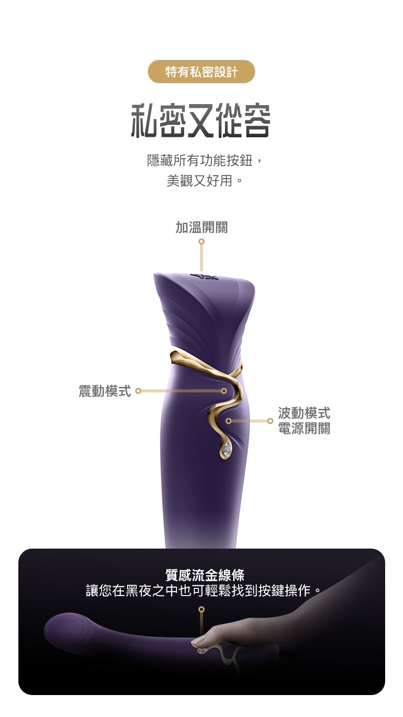・使用道康寧矽膠提供嬰兒般的親膚觸感,流線外型設計,搭配ABS電鍍及施華洛世奇水晶鑲嵌,給您無比尊榮的品味享受。・特有的吮吸功能,仿真人手指波動震動,加上可預熱功能,獨立可控雙馬達,除機體震動外,還可以使用APP控制,創造您特有的愉悅模式。・方便特有的磁吸式充電及旅行鎖,讓您可以安心的隨身攜帶。統御慾望