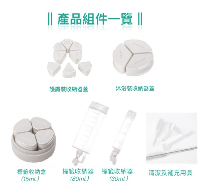・內容物:分裝收納罐(沐浴+保養各1)、30ml按壓瓶*6、80ml按壓瓶*3、15ml密封盒*4、備用上蓋*3(S-1~S-3)、漏斗*2、滴管*2、清潔刷*1