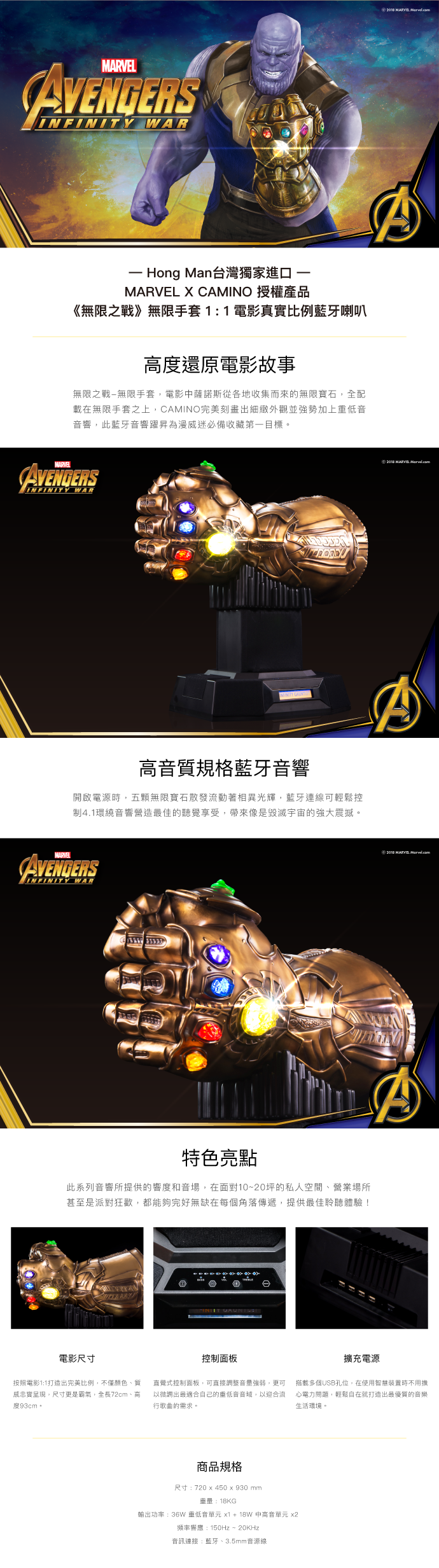 高度還原電影故事無限之戰-無限手套,電影中薩諾斯從各地收集而來的無限寶石,全記 戴在無限手套之上,CAMINO完美刻畫出細緻外觀並強勢加上重低音 音響,此藍牙音響躍昇為漫威迷必備收藏第一目標。高音質規格藍牙音響開啟電源時,五顆無限寶石散發流動著相異光輝,藍牙連線可輕鬆控制4.1環繞音響營造最佳的聽覺享受,帶來像是毀滅宇宙的強大震撼。特色亮點此系列音響所提供的響度和音場,在面對10~20坪的私人空間、營業場所 甚至是派對狂歡,都能夠完好無缺在每個角落傳遞,提供最佳聆聽體驗!![]()