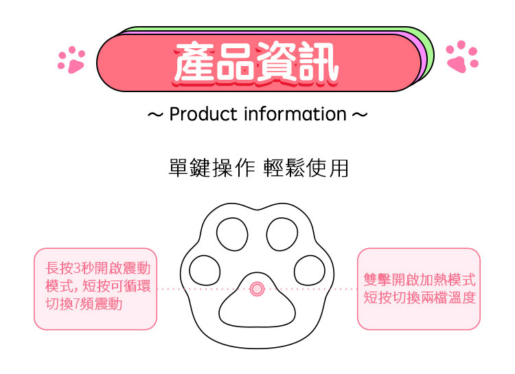 ・過熱保護:震動時加熱,可啟動溫度調節功能,防止在使用時灼傷