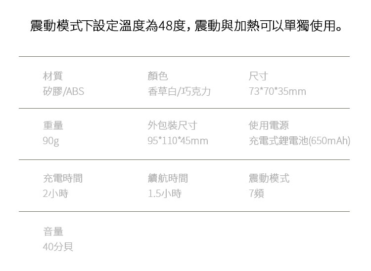 充電時間:1.5小時,一次充電完成可連續加熱最大強度震動90分鐘