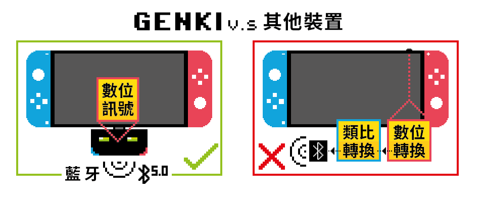 相較於市面上接耳機孔的藍牙裝置必須透過兩度音訊轉換 ( 數位→類比 ),GENKI 直接由 USB-C 介面傳送數位音訊,使用上更直覺、音質更好、延遲更短。