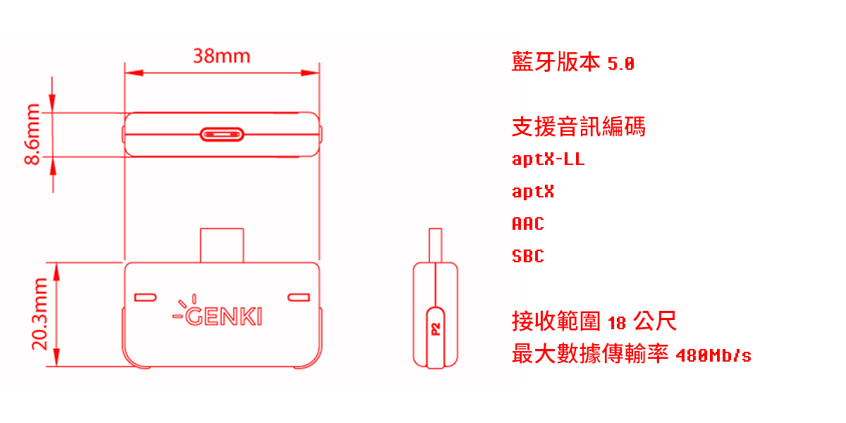 尺寸:38 mm * 20.3 mm * 8.6 mm材質:塑膠規格:藍牙版本 5.0