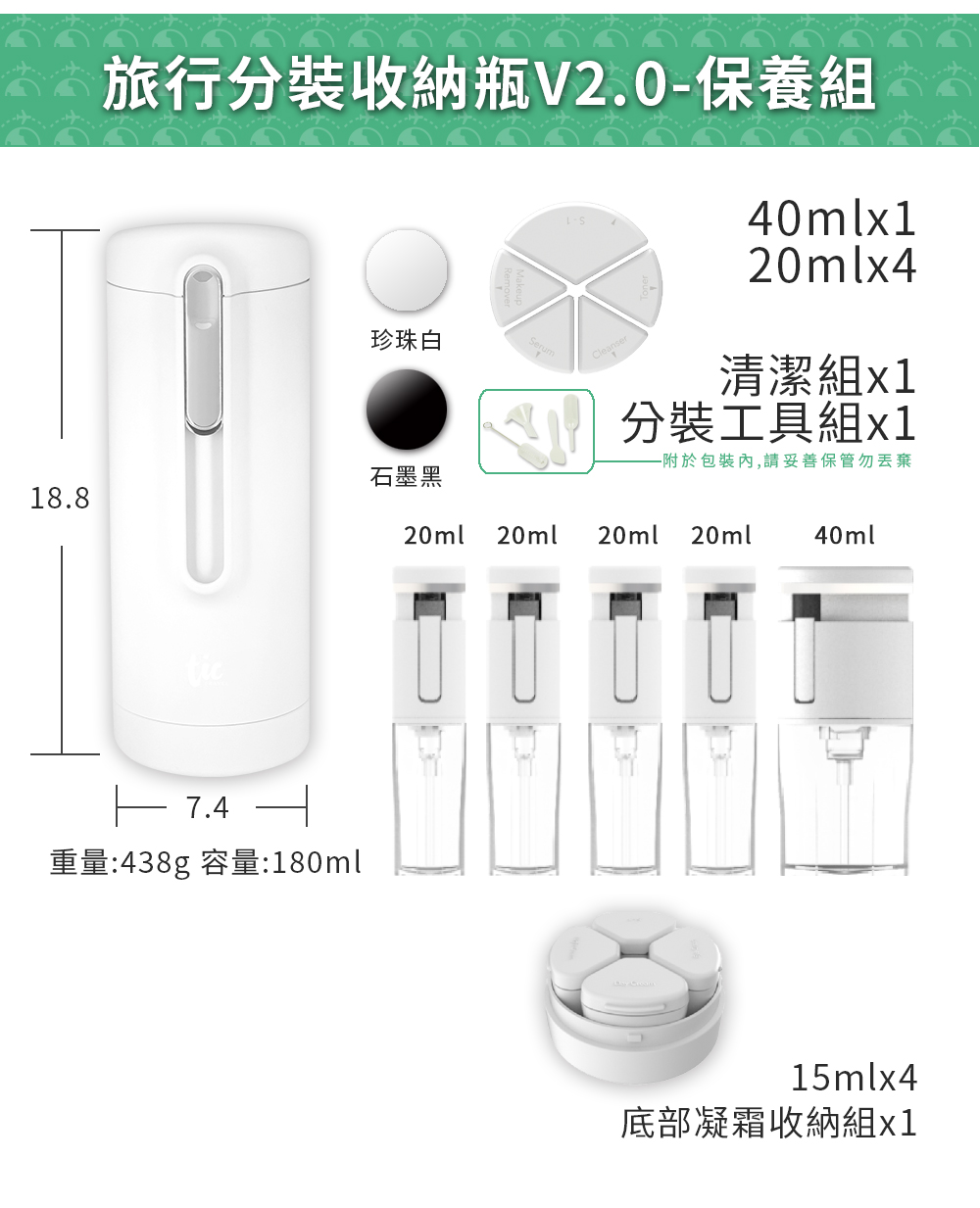 商品內容物: 旅行分裝收納瓶 V2.0- 保養組*1,20ml分裝瓶*4,40ml分裝瓶*1,15ml凝霜收納罐*4,清潔組*1,分裝工具組*1