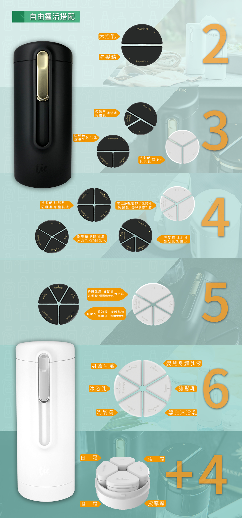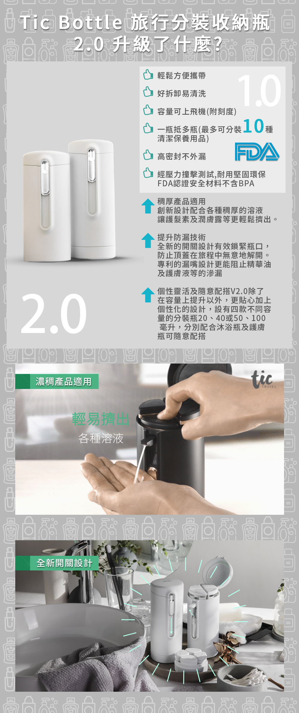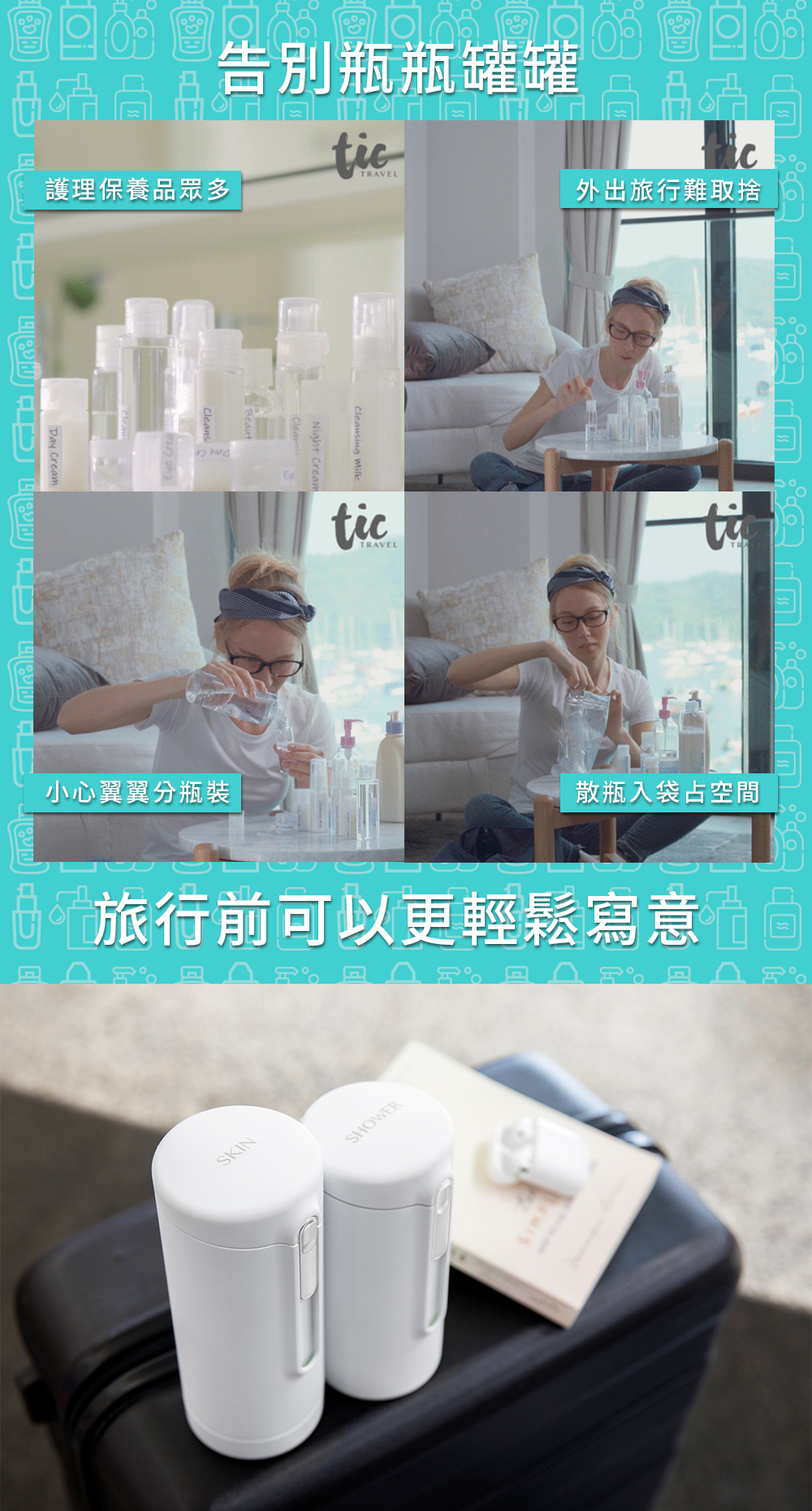 TIC 旅遊收納瓶乍看之下像個保溫瓶,一手握得住的大小,有著輕量級的便利。依據按壓瓶容量的大小和數量,分為護膚用品收納瓶,和沐浴用品收納瓶兩款,兩款的收納按壓瓶都可以自由取出 Mix & Match,大瓶配小瓶來個升級版的旅遊收納瓶,清潔保養一瓶搞定!