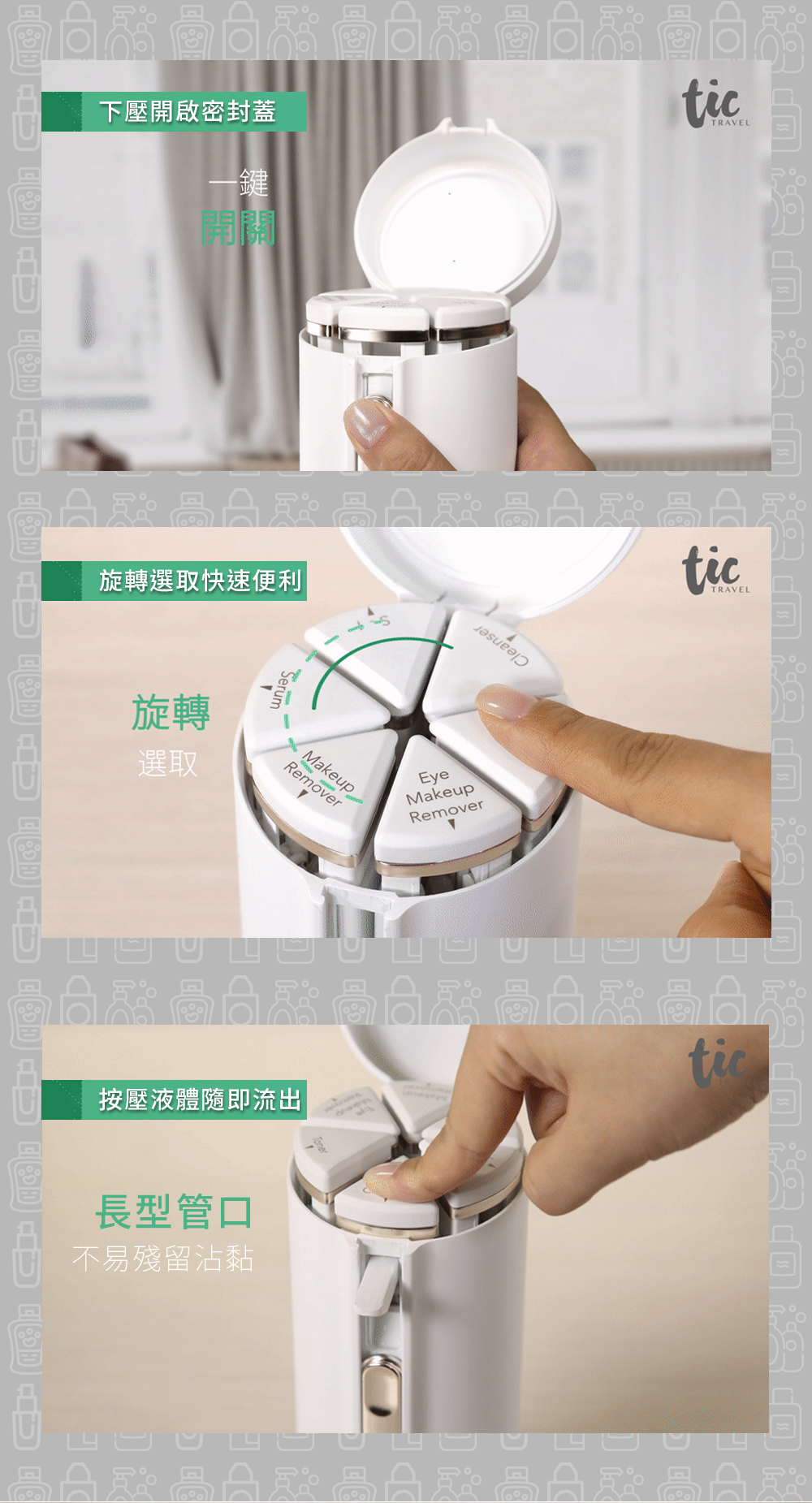 那麼那麼~TIC 智慧旅遊收納瓶到底要怎麼使用呢?不管是護膚用還是沐浴用的收納瓶,使用方式都相同,只要簡單的「轉拉壓五步驟」!