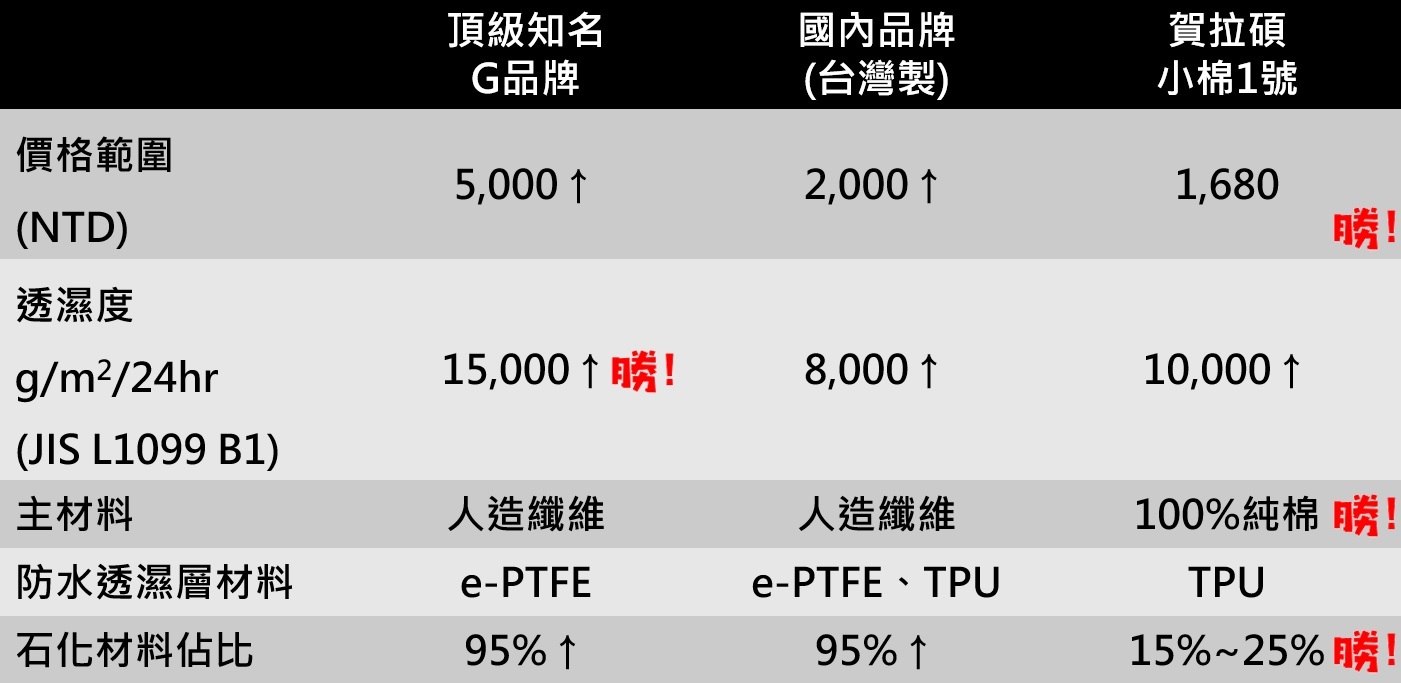 團隊也簡單列出目前雨衣的各種比較,大家在選購時可以有個參考依據,當然也希望屆此強調自己的長處,以及追求棉質的重要精神啊~