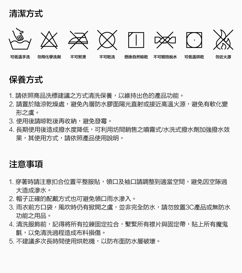 除了以上的特性外,這款兩件式的風雨衣有可收納隱藏式帽子、能快速穿脫的防黏網設計、方便付錢的斜插口袋、不易灌水的鬆緊袖口、可調整腰寬的鬆緊帶等設計,讓雨衣更加符合人性,不再是一穿即丟的消耗品。