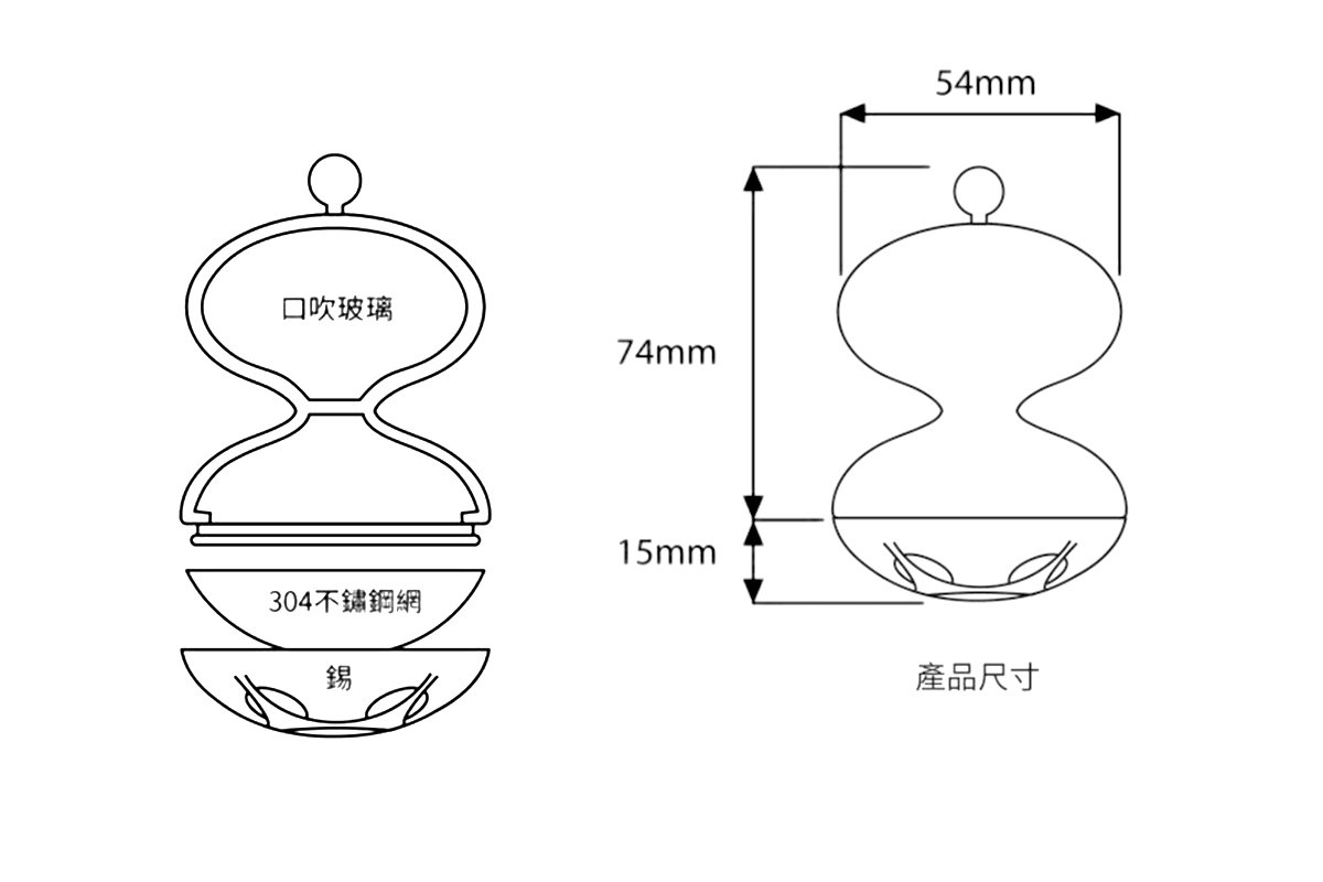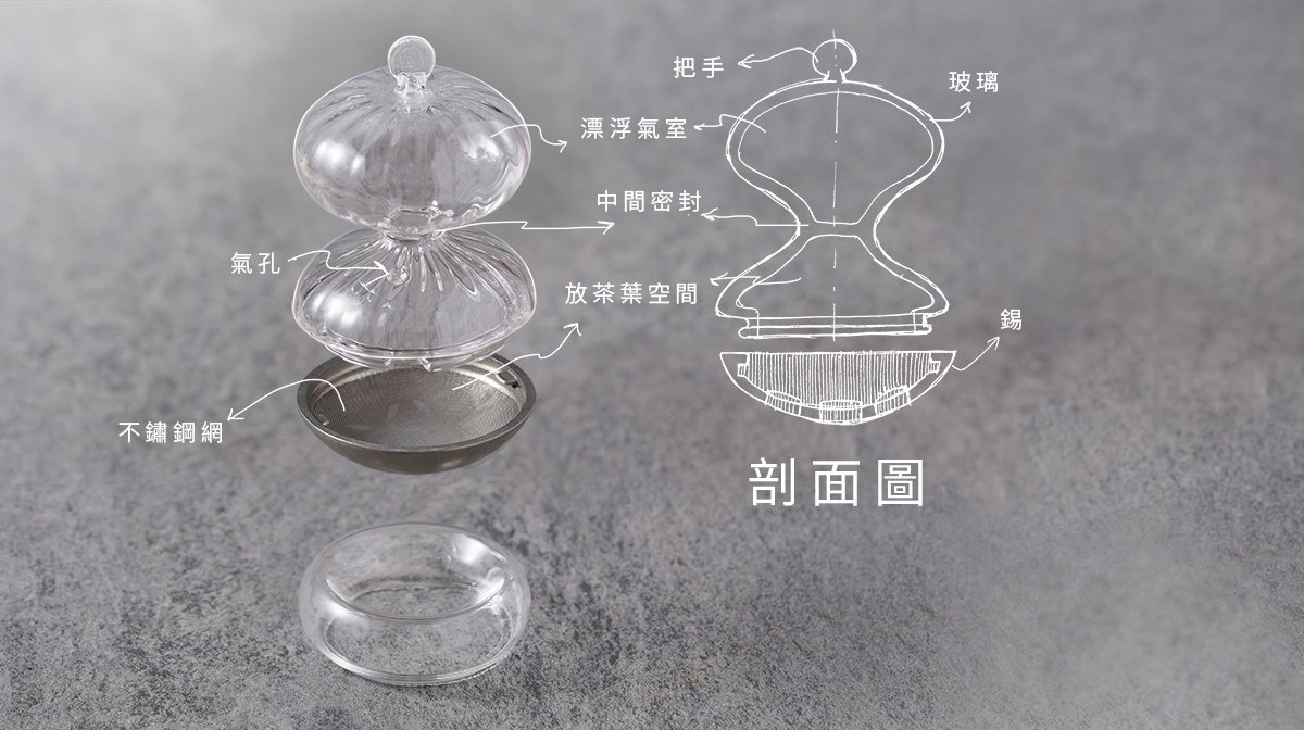 上半部:為玻璃製的完全密閉氣室,是醇茶器可漂浮水面的主因,同時,不用擔心上方玻璃空間難以清洗的問題。下半部:由玻璃與錫器接榫結合,內含不鏽鋼細網,為放茶葉的空間,可泡製 700cc 的茶湯。( 是否可回沖依茶款特性而定 )![]()