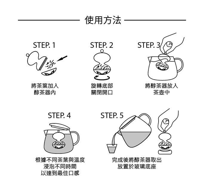 浮雲醇茶器下半部空間可以容納2-4g的茶葉,適合沖泡約1人分約 650cc 的茶湯,可以沖泡紅茶、綠茶、花草茶等等,適合使用於各種茶葉。