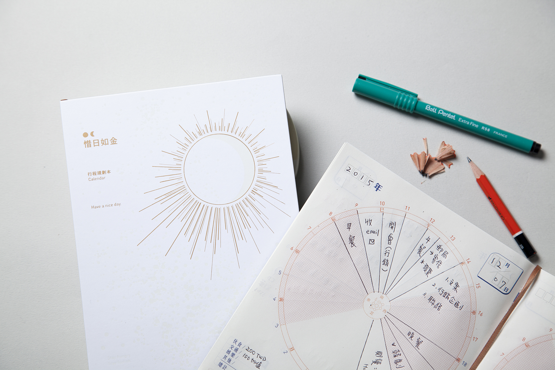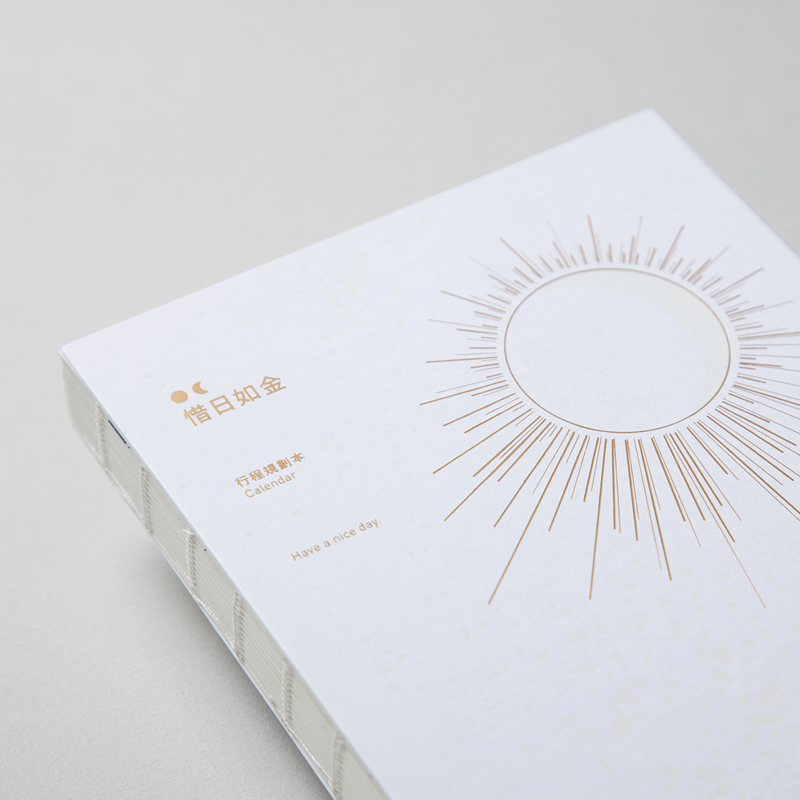 轉化日曆的概念,將每一天的記事集結成冊。封面在光亮底下,會吸收光源,夜晚時封面的月亮就會出現,太陽會淡化。象徵日以繼夜活動的人,不論何時都把握每分鐘,時時刻刻活得精采。