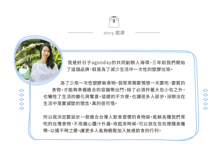 所以我決定要設計一款適合台灣人飲食習慣的食物袋。能裝各種我們常吃的台灣食物,不用擔心醬汁外漏。收起來時候,可以放在包包裡隨身攜帶,以備不時之需」