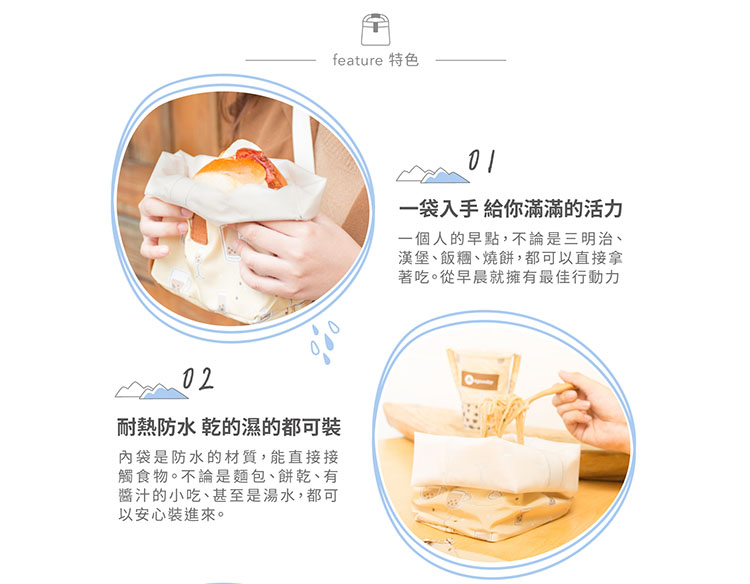 相較於西方的冷食三明治文化,我們還是常吃湯麵、滷味、煎餃水餃等熱食。來自台灣品牌好日子 agooday 的設計「Pockeat食物袋」,在執行無塑理念之餘,也更貼近台灣人的飲食習慣,以食袋的形式,裝湯、裝麵、各類小吃、或甚至早餐蛋餅、蘿蔔糕、吐司蛋等等,從早裝到晚,讓塑膠袋和淋膜紙盒少用一個是一個,攜帶起來更方便。