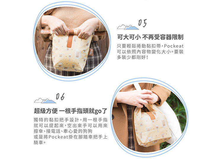 Pockeat食物袋有自己的黏扣帶,結構簡單卻有效的魔鬼氈提把,手拿或者掛在腳踏車把手、機車掛鉤上都很方便。