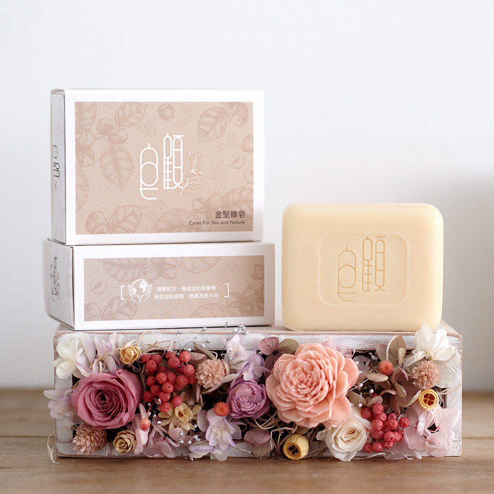 成分相對簡單,而名稱很台味的「金堅糠皂」,正是台語「很健康」的諧音,取其成分的字頭來命名,金盞花和德國洋甘菊萃取是舒緩肌膚、淨化毛孔常見的明星成分,搭配堅果油(榛果)和米糠油提高滋潤度,不含色素、香精甚至精油,以低刺激配方來維護肌膚健康。