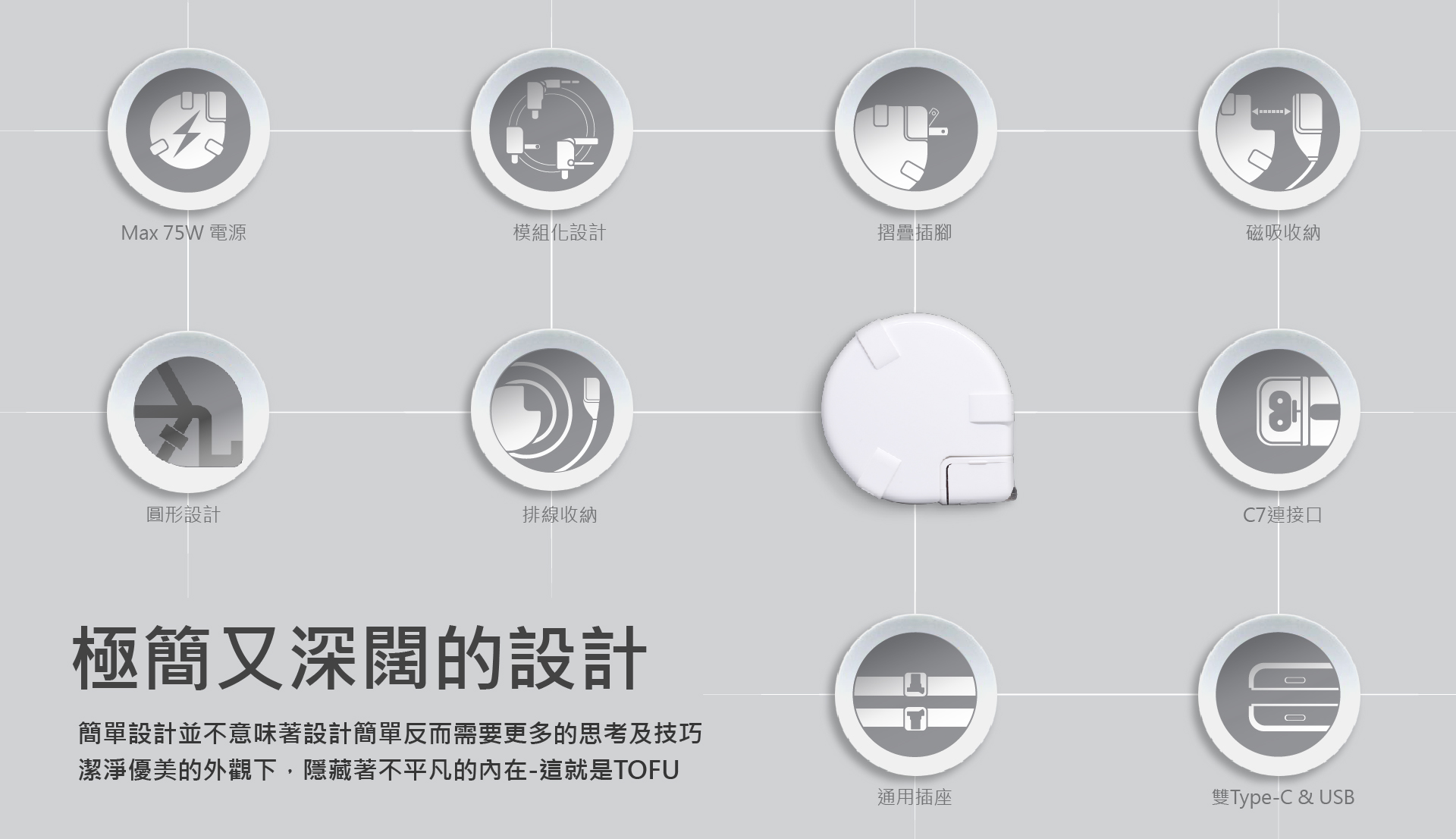 「TOFU MARU」的圓形排插結構,釋放插孔之間的限制,在最精簡的空間條件之下,利用圓弧切線原理展開的扇形空間,讓變壓器們更有餘裕安置,除了基本的插座功能,同時也支援USB、Type-C和萬國轉接頭,不僅功能齊全,最直接的優點就是為你省下攜帶各種充電傢私們的麻煩,一顆 TOFU MARU 就統統解決。
