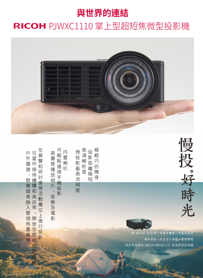 遇到生日派對、或者平常三五個家庭聚會時,可以投影動畫電影讓小朋友們統統坐定位,讓大人們得以獲得珍貴的休息時光(重要!),或者外出體驗露營時,也能投影動畫電影讓小朋友們統統坐定位(真的很重要所以要再講一次),輕巧便攜又兼備影像表現能力的 RICOH 會是個很棒的家庭娛樂器材。
