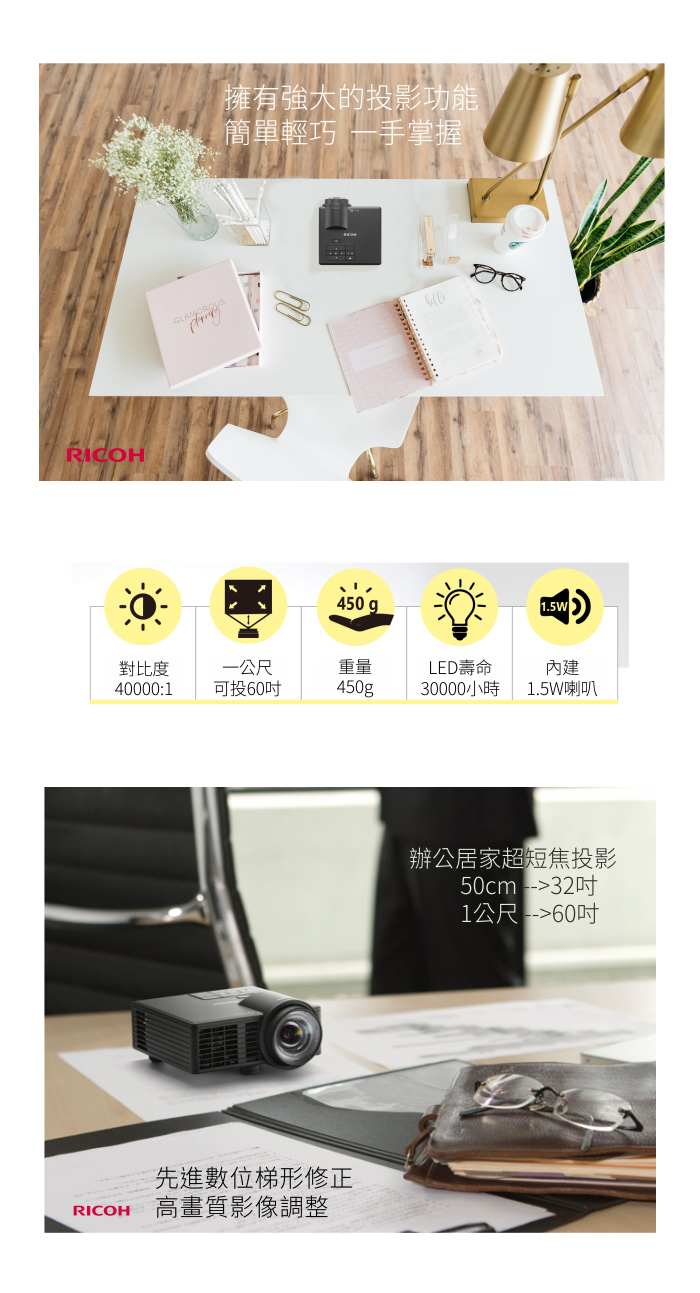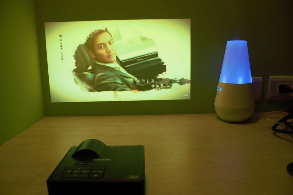 RICOH 有短焦投影能力,短短 50cm 就能投出 32 吋螢幕,最短最短距離,大約可以就是手機大小的螢幕(比照片中還近一點),最大則可投到 100 吋,在這個範圍之間,都能隨著場合不同隨心所欲調整,有著 600 流明度和 40000:1 的對比度做後盾,都能投出令人滿意的效果。內建2.8G記憶體