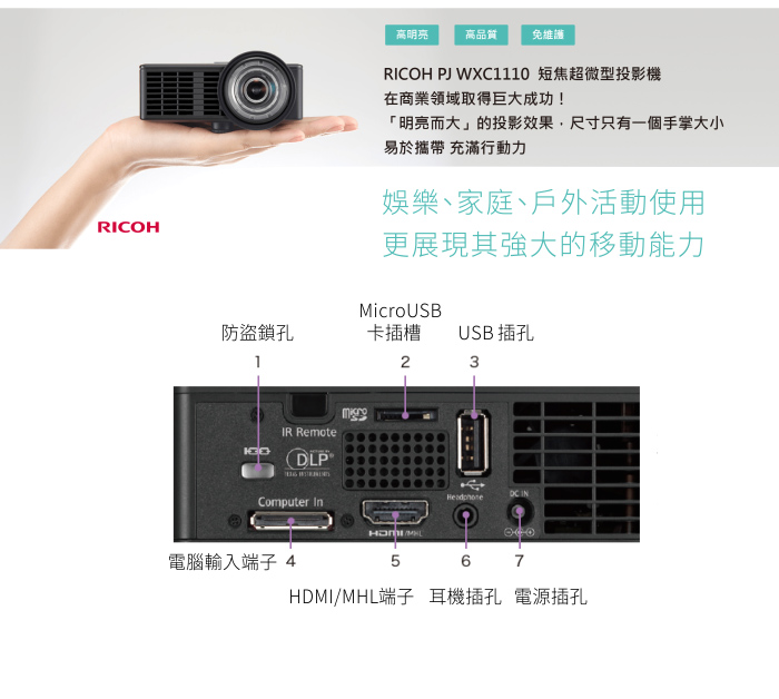 RICOH 掌上型超短焦微型投影機PJ WXC1110
