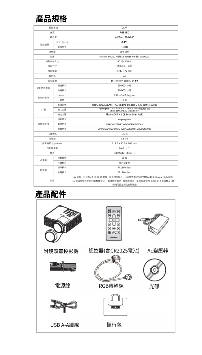 由 RICOH 推出的便攜式短焦微型投影機(PJ WXC1110),體積很小,重量更是沒得挑剔的 450g,但卻有相當優秀的流明度和畫質表現。