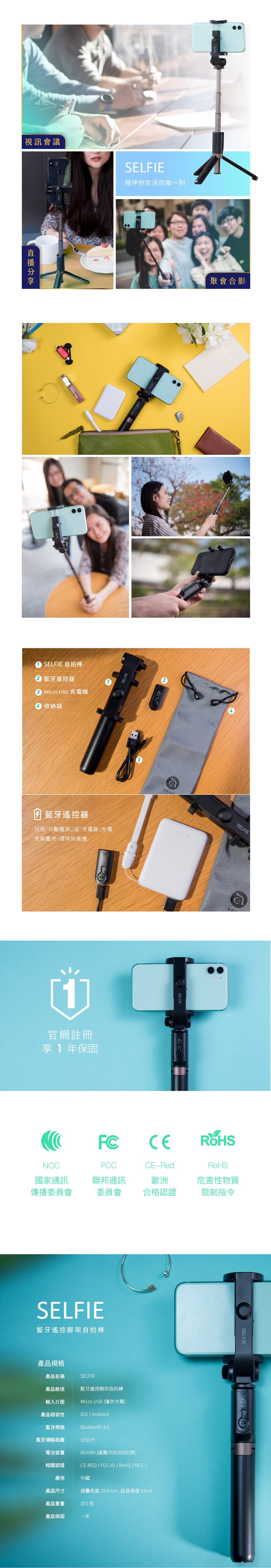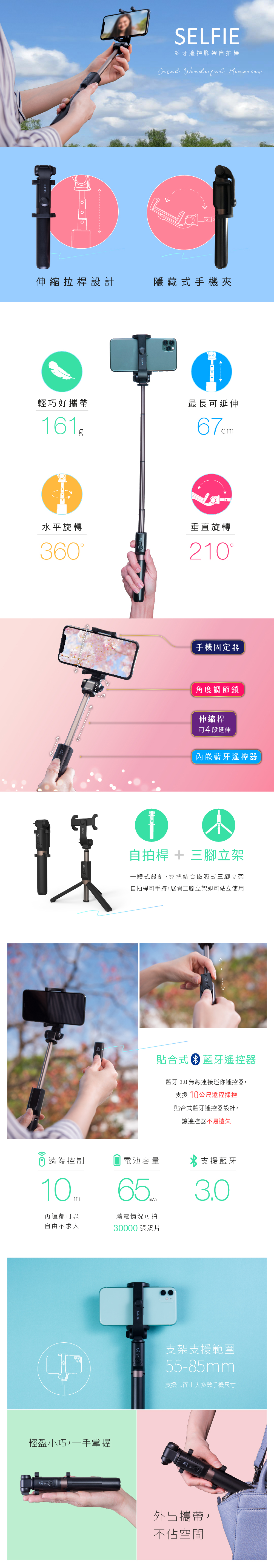 ● 創新一體式設計,自拍桿結合三腳架,根據拍攝需求自由切換。
