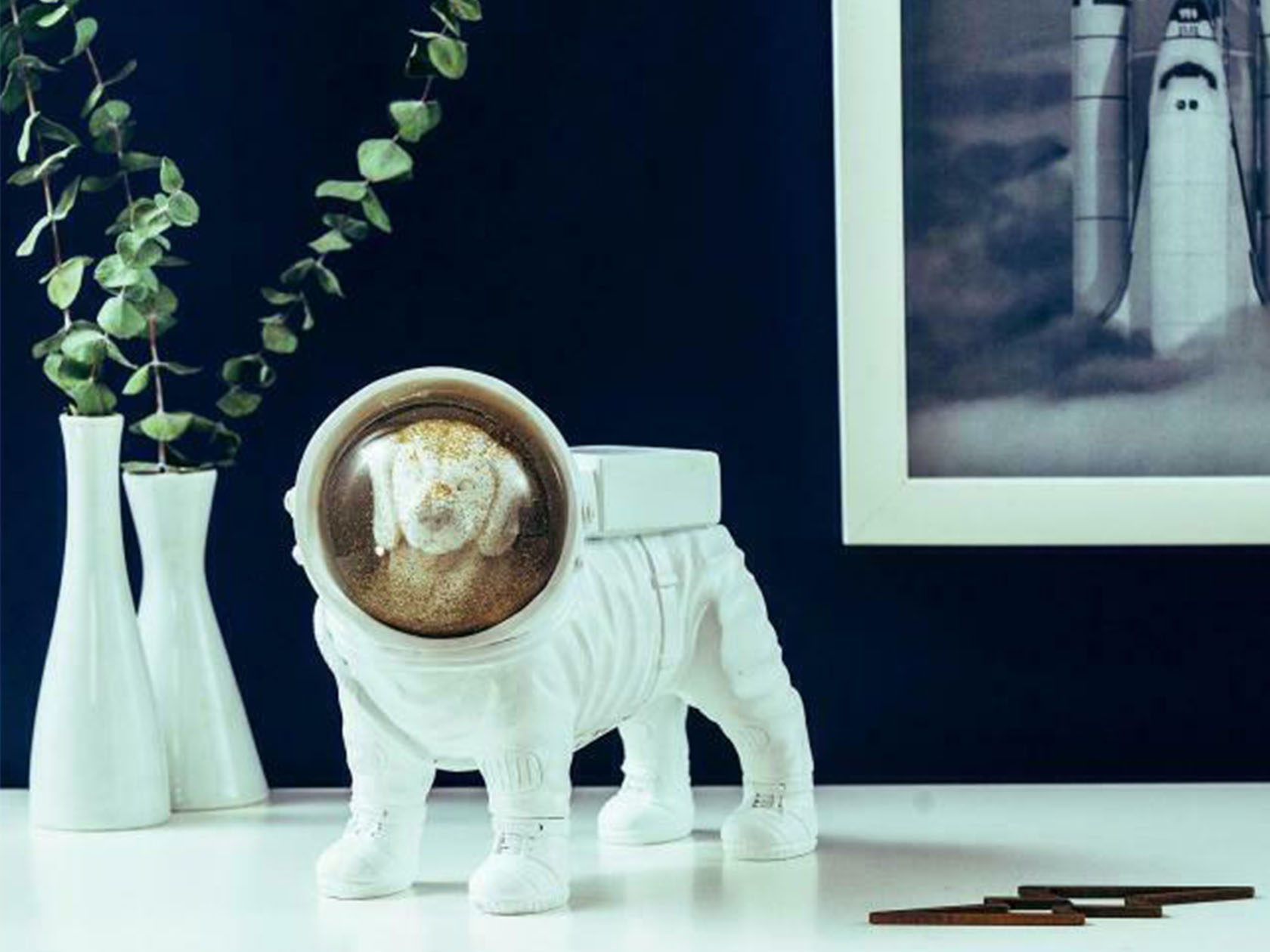 ◆ 精緻的金色閃光片在狗狗太空人充滿水的頭盔裡,只需搖晃,效果極佳