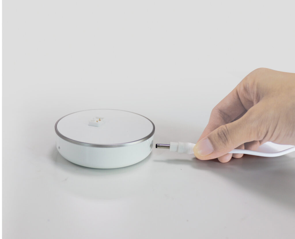 1.取出智能底座 2.將電源線連接智能底座 3.將裝好自來水的分享瓶置於底座上 4.按壓啟動鍵,靜候15分鐘後抗菌液製作完成 e立淨的「高活性氧抗菌液」