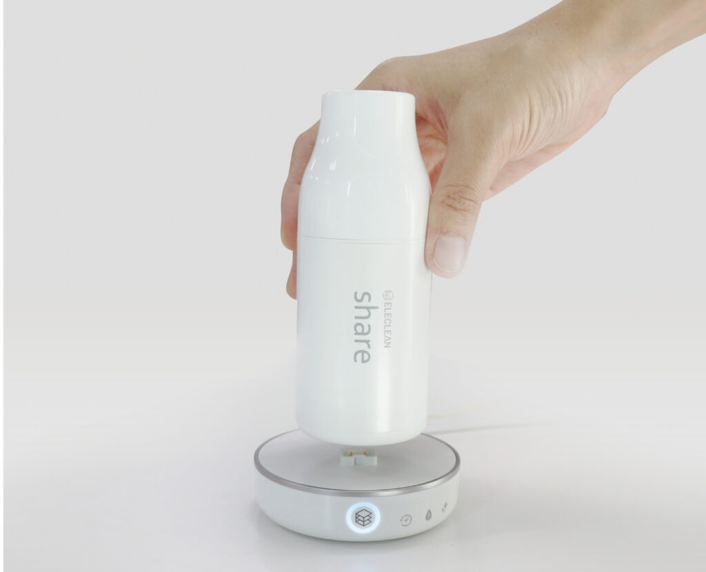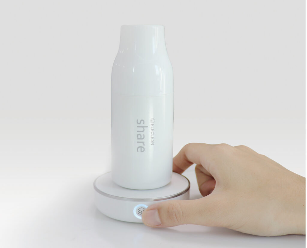 ELECLEAN share 以”share分享“為訴求,針對辦公室和家庭族群使用,一個智慧型底座可以給無限多個電極分享瓶共同使用,在辦公室環境下,可以是部門同事們共用一個底座來製作高活氧除菌水,再分別透過自己手機裡的APP確認活性效力。