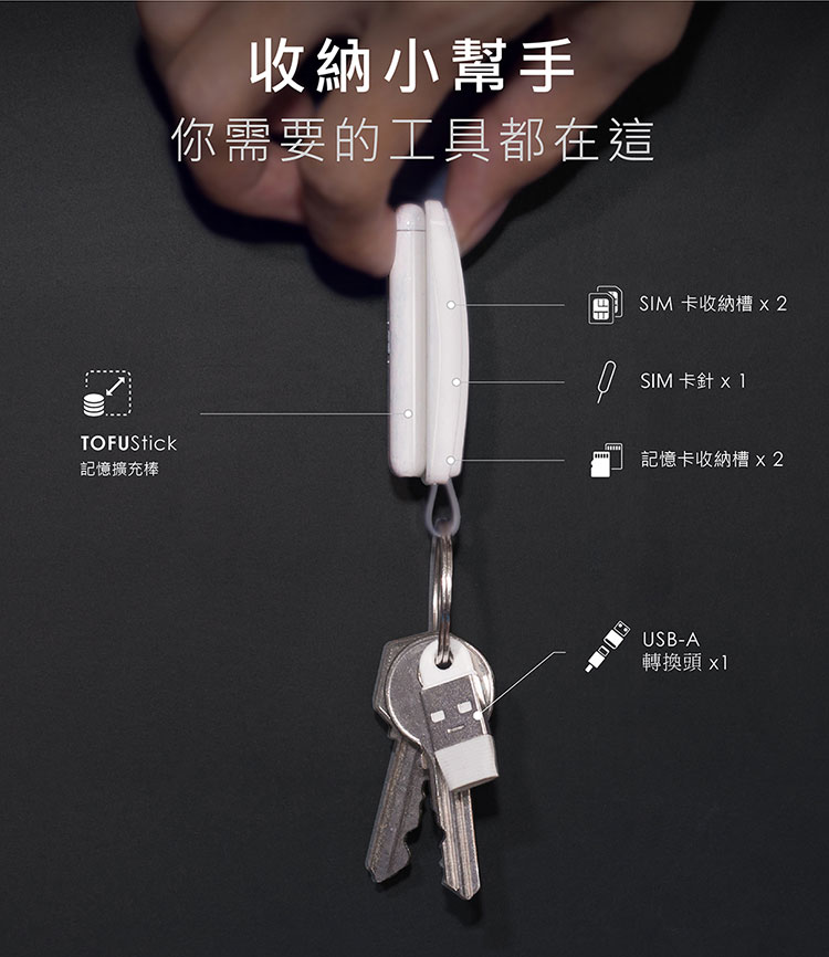 TOFUstick配備了一個專用的鑰匙圈,當長時間不用 Stick 時可以收藏在鑰匙圈中,而鑰匙圈同時設計可隱藏收納備用 T-flash 卡等配件之功能以備不時之需 ( 產品不含 Micro SD 記憶卡與 SIM 卡,僅供示意 )。