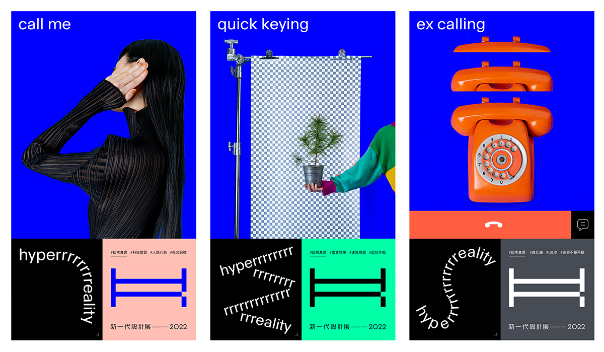 第三組視覺則藉現在人人手上的智慧型手機與舊式桌上型撥號電話外型已無關聯,卻仍以一枚復古的話筒圖形在接聽與「掛斷」電話,幽默對比出科技演化及時代更迭中的變與不變。而在三組視覺版面中,還可發現「Hyper Reality」主題字樣的呈現,幽默連結了去年的主視覺梗,曾於網路存在卻未實體發生,也正呼應著主題的「超常真實」。在首波視覺曝光後,設計團隊更將分別以靜態與動態視覺,靈活詮釋更多議題內容,並於開展前陸續釋出。