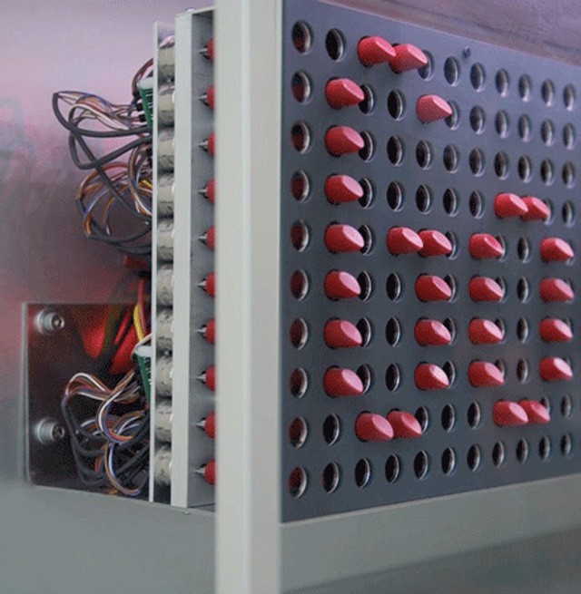 從遠處看,這款偽LED顯示器,真的看不太出來是用口紅做的,也滿佩服Janet Zweig有那麼多閒工夫把口紅當成LED來使用,其實這機器運作的原理還滿簡單的(不過說簡單,我想一般人也做不出來吧?)利用IC版控制馬達運轉,利用電子運算將口紅在正確的時間推出和收回,就可以完成一幅類似LED表現的顯示器了。
