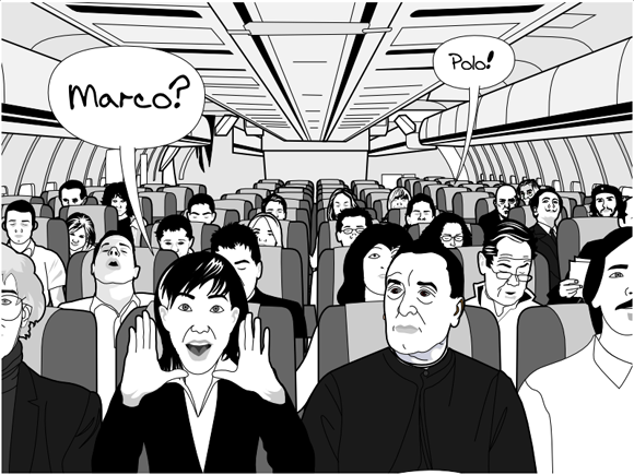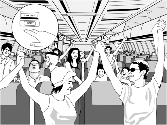 首先將機艙乘客分成兩邊,以不能打開安全帶為原則,用手牽手的方式看那邊最先從頭連到洗手間,萬一遇到不想玩的乘客,就當成是遊戲中的障礙,必須利用數學運算與能力計算出距離廁所最近的途徑,那邊最先觸到洗手間的隊伍就獲勝。但這個遊戲最大的挑戰是玩完之後,可能洗手間就會大排長龍吧XD~