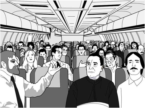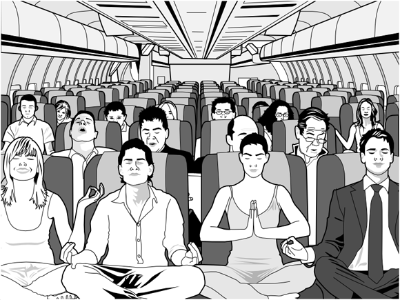 恩,我們都知道飛機失事最危險的時刻,就是起飛與降落這兩個時間,所以很多乘客在架落前都會深深的祈禱,與其一個人禱告到不如大家一起來靈修啊!總之,萬一失事了,還有這些人可以陪你一起上天堂或是地下18樓啊XD