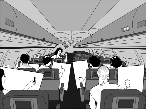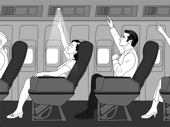 對!就像是棒球場上的波浪舞一樣,飛機上的乘客可以利用頭頂的閱讀燈,來玩接力按燈的「波浪燈舞」,不需要離開座位,全飛機的乘客都可以參與,默契好的話,大概來回三百趟就可以到美國了喔XD~