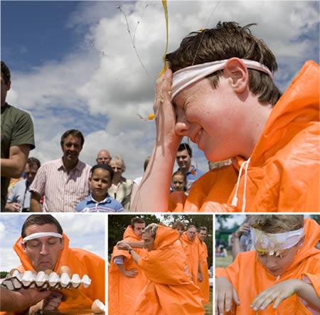 從2006年起,英國Swaton每年都會舉辦扔雞蛋大賽,可別以為扔雞蛋只是把雞蛋亂扔一通而已,他們可是非常嚴肅的把比賽分為好幾個項目,包括一個人丟、一個人接的throw and catch,11個人一組將12個雞蛋平安丟完100公尺的雞蛋大隊接力,在額頭上綁手帕然後用頭擊破雞蛋的雞蛋版俄羅斯輪盤,輸家就是第一個挑到生蛋而不是熟蛋的倒楣鬼。